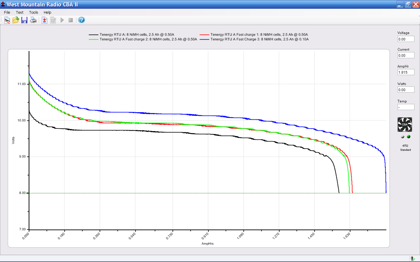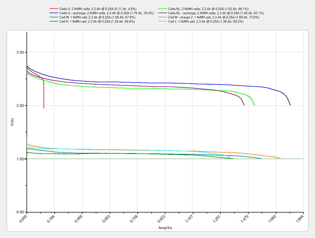 The red blooper shows that you can’t trust a smart fast charger to get the right answer; it concluded that pair was fully charged. After the discharge test and an overnight C/10 charge, they regained as much enthusiasm as they’ll ever have.