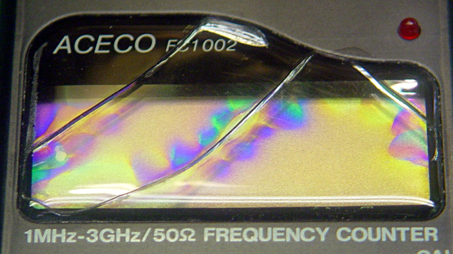 Here’s what the (cracked) faceplate of the FC1002 Frequency Meter looks like, through polarizing filters that reveal the internal stress.