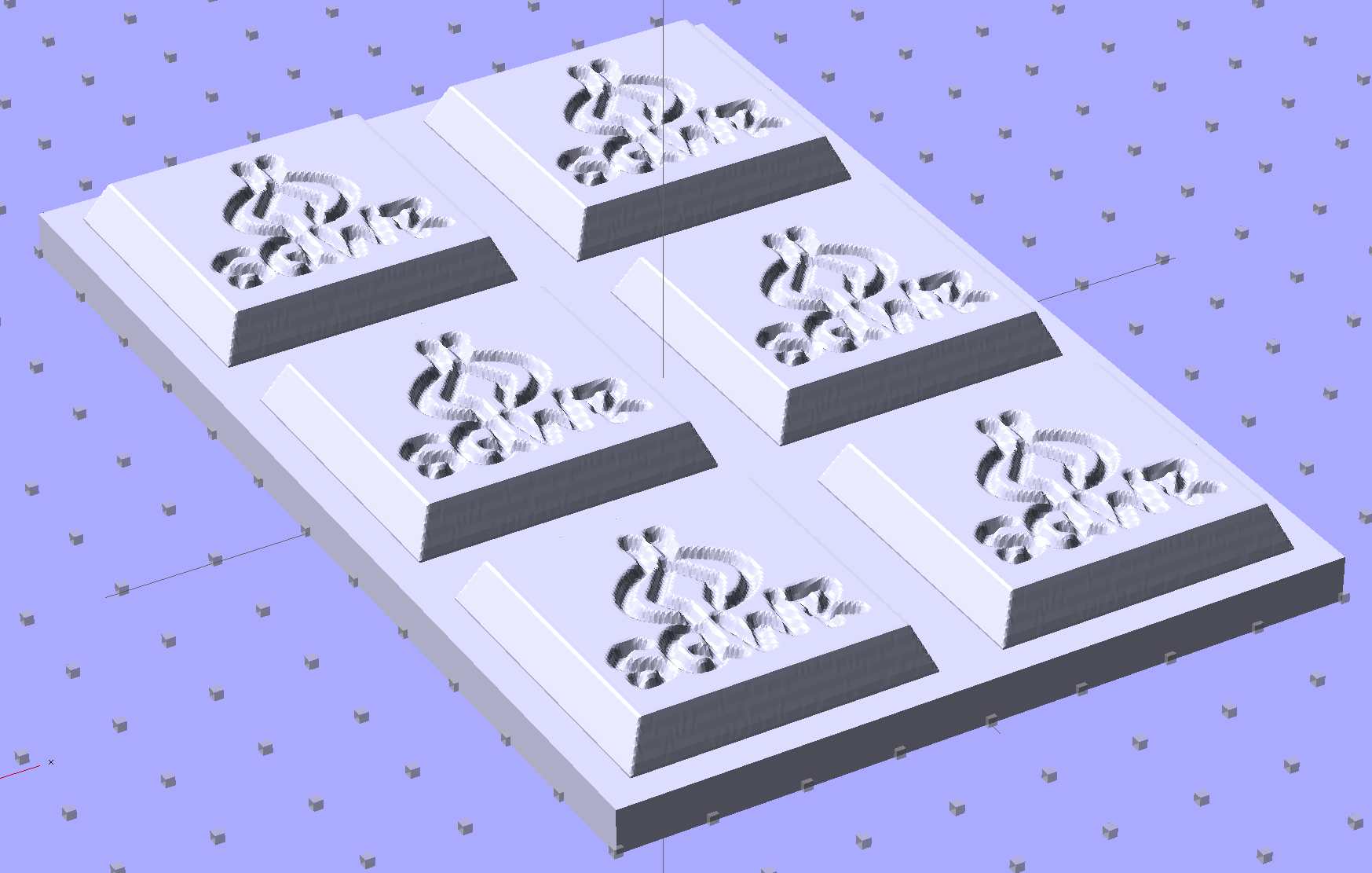 It’s not clear having OpenSCAD labor for half an hour to generate and emit a single STL file spanning all six molds is a win. Given that you don’t care about the mold-to-mold spacing, having Slic3r duplicate the same small STL file half a dozen (or more!) times would probably be a net win.