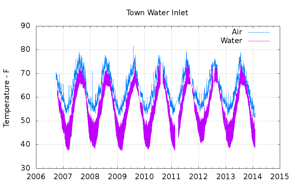 Back in 2006, I clamped a Hobo temperature sensor onto the pipe that delivers town water from the main, under 150 feet of front yard, and into our basement:
