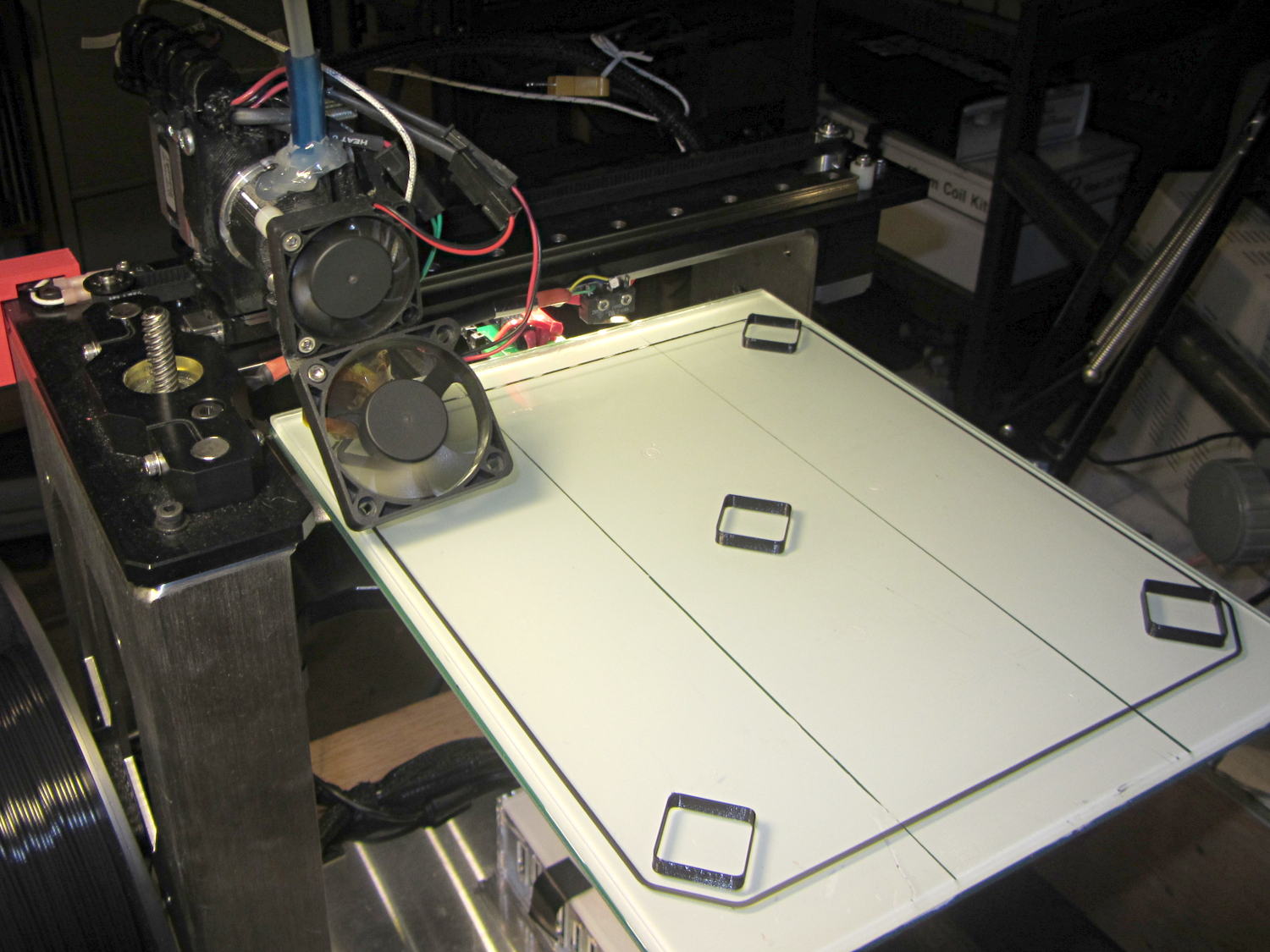 Tweaking the three leveling screws under the platform and iterating with more boxes eventually got the platform aligned to about ±0.07 mm across the 200×250 mm platform diagonal; supper got in the way of repeating the last test. The bird’s nest failure of the left-front box in that test looked like an adhesion problem; in the heat of it all, I built four sets of thinwall boxes on exactly the same spots without renewing the hairspray coating.