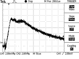I’ve used the same trick to measure the light curve from electronic flashes. Here’s one at full power http://www.vitriol.com/images/tech/equipment/microflash/minolta-full.png and the same one at minimum power: http://www.vitriol.com/images/tech/equipment/microflash/minolta-low.png You can see the leading edge (and the burst of noise from the trigger coil) are similar, but at low power, it cuts off abruptly before it really gets going.