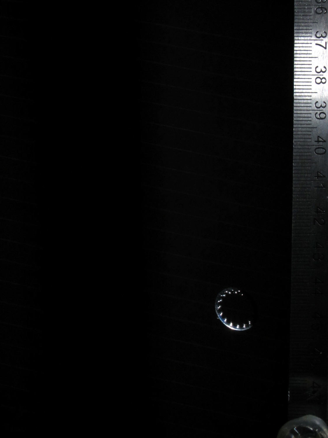 That’s ISO 800, 1/10 s, f/8, 30 cm manual focus, with the flash about 20 cm away in the right foreground. The Xenon flash has a 1 µF capacitor giving a pulse width of about 100 µs. The LED visible on the lower right flashed 1 ms after the lump broke the laser beam.