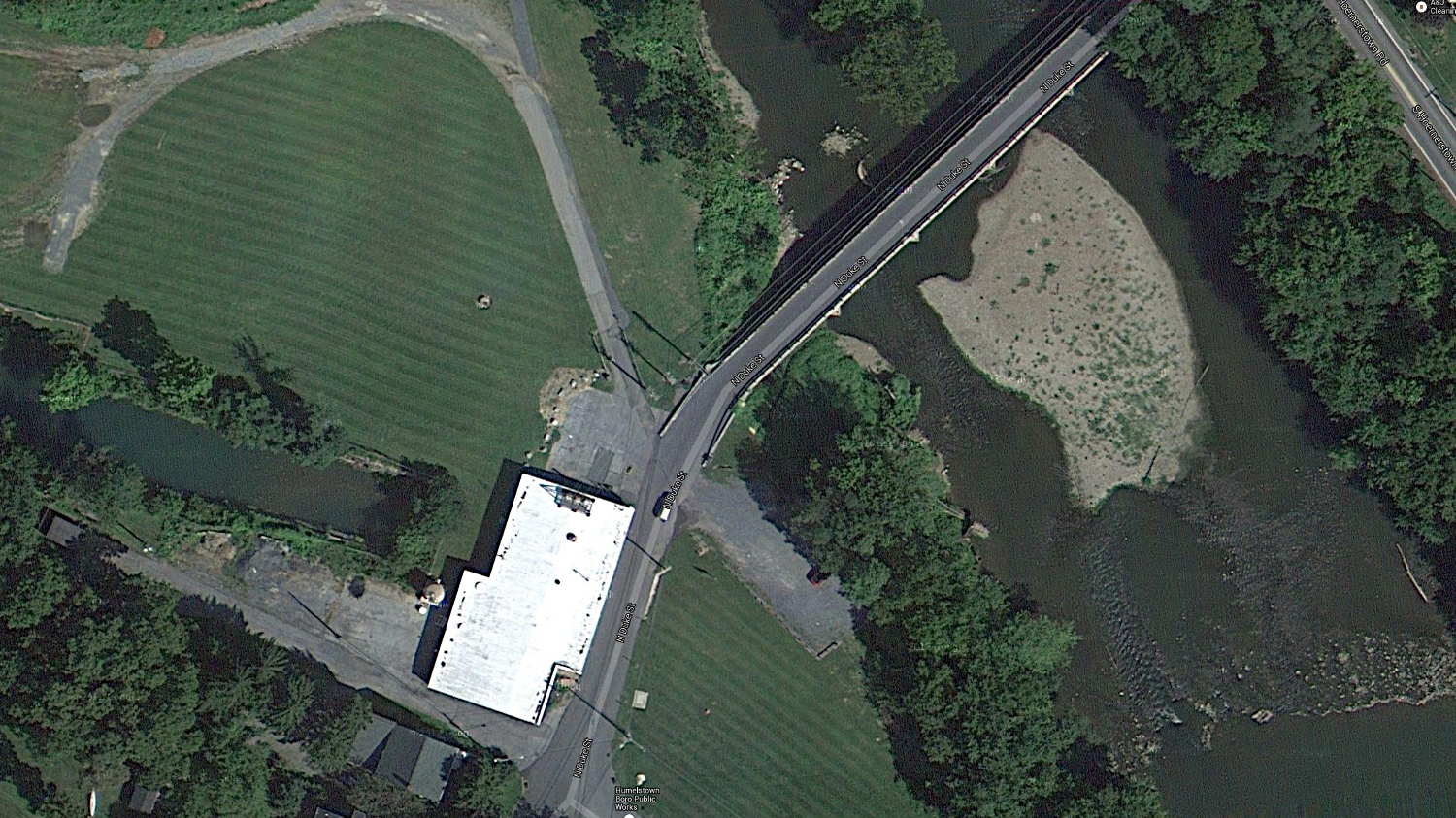 Judging from the perspective and the row of bushes, the old tank probably stood across the (now abandoned) tailrace, near that little dot in the mowed area. The dam (in the lower right corner) washed away during a flood some decades ago; I have no idea where Hummelstown gets its water.