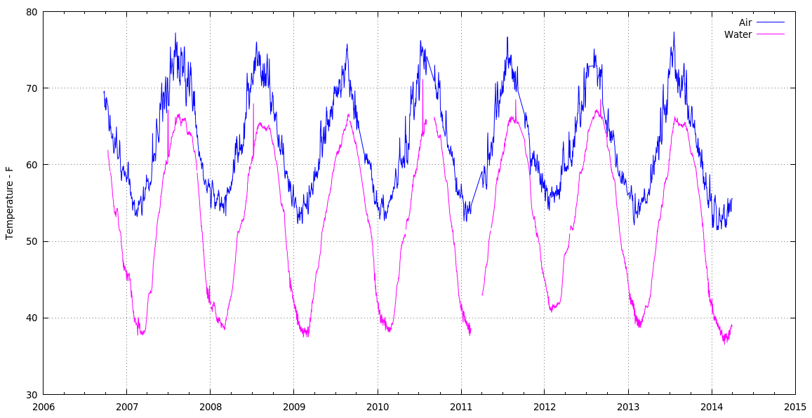 The data consists of all 3/4 million data logger records concatenated into one huge CSV file, fed through a Sed pipe to normalize all the dates & suchlike, then passed into a Python script that produces one record for each day (all 2561 of ’em) containing the date, minimum air & water temperatures, and the minimum relative humidity.