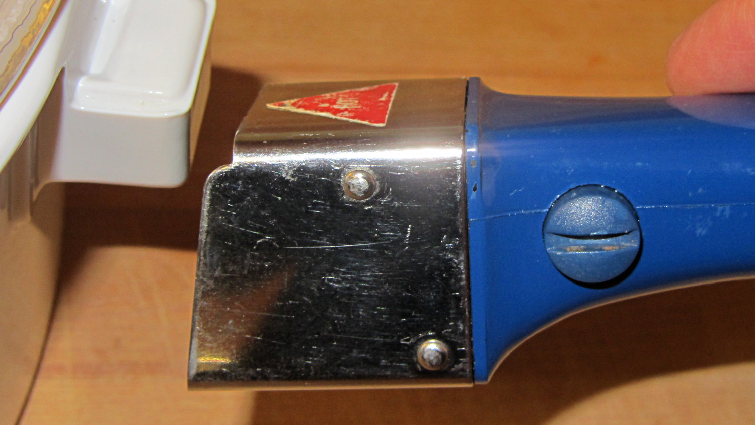 Latching the handle in place is simple: put the end of the handle over the tab and squeeze the lever until it snaps into the handle. Well, I managed to latch it quite easily, after which nobody could figure out how to release it. That slotted button cries out to be pushed, but it wasn’t push-able.