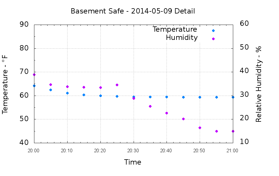 Back in early May, I swapped in a new bag of silica gel, which (as always) immediately punched the humidity down to the Hobo datalogger’s 15%RH minimum reading: