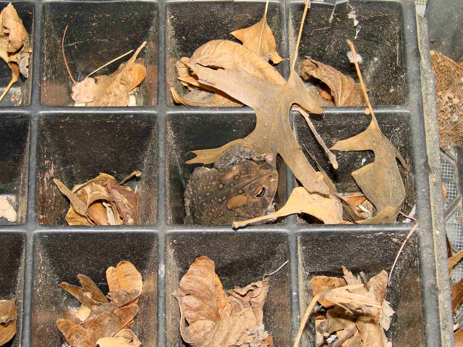 It seems toads really like the plant cell packs that Mary uses to start her garden veggies: