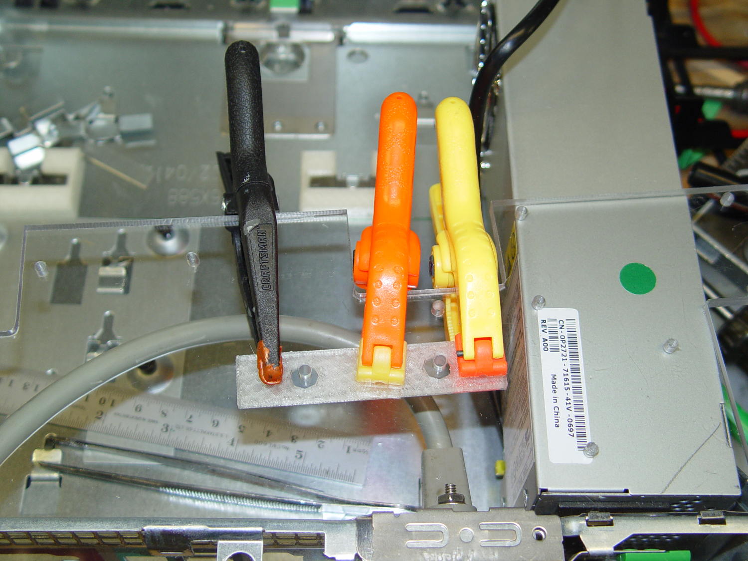 Mounting it on the polycarbonate sheet inside the repurposed GX270 case involved drilling & tapping a pair of 6-32 holes in one side: