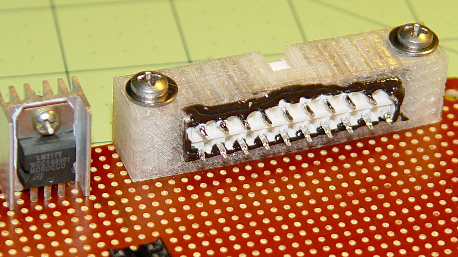The GX270 case contains a perfectly serviceable ATX power supply that can power all the bits & pieces that don’t run directly from the AC power line. I torched the connector off the system board, but there’s no practical way to mount it standing up through the prototyping board I’m using for the low voltage electronics. This bracket surrounds that connector and holds it at right angles to the board, with a pair of screws clamping it in place: