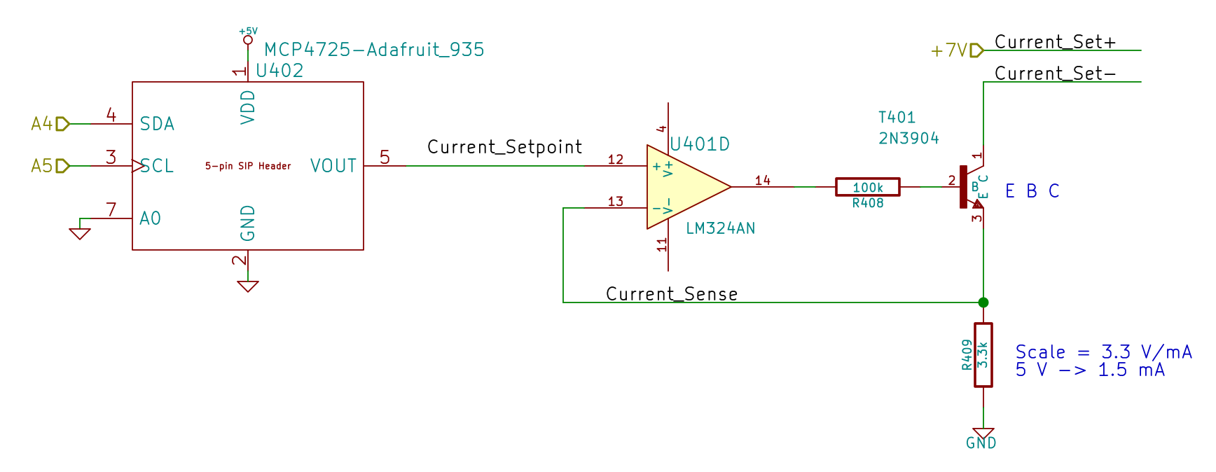 R409 scales the gain so that +5 V tops out around 1.5 mA, which should deliver a collector current around 3 A: far more than seems absolutely necessary. R408 lets the op amp develop some voltage while trickling a few dozen microamps into the 2N3904’s base; the hFE runs around 50, so the error due to base current amounts to maybe 2% and, remember, the final current depends on the temperature anyway.