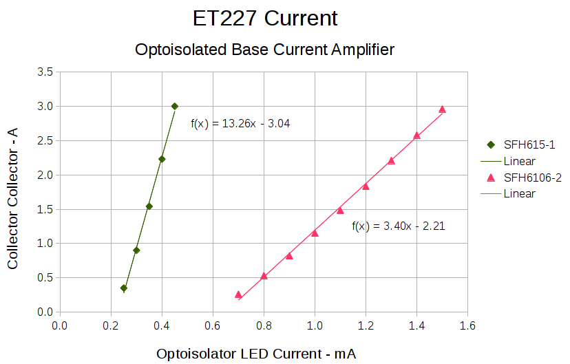With all those parts safely secured, I ran some end-to-end current measurements from the optoisolator’s LED to the ET227’s collector current, with a safe 10 VDC applied to the collector: