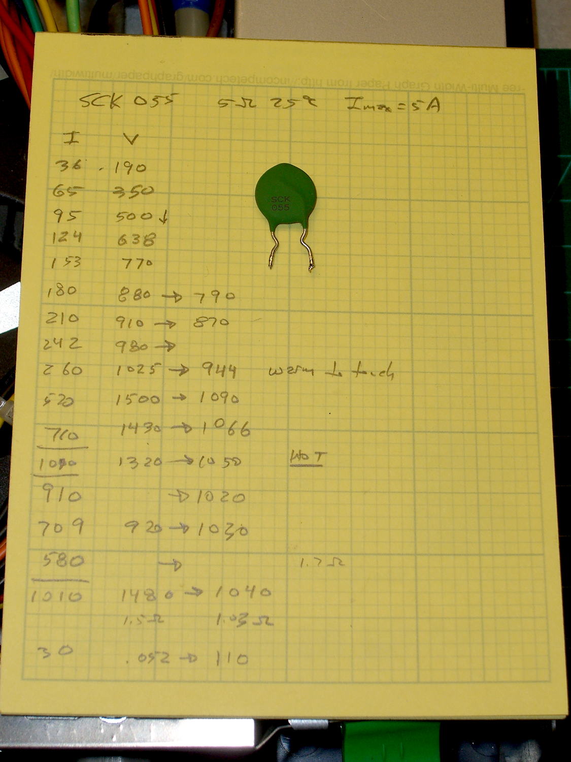 While pondering the dead ET227 transistors, I dug an inrush current limiter (a.k.a. NTC power thermistor) out of the heap and made some measurements: