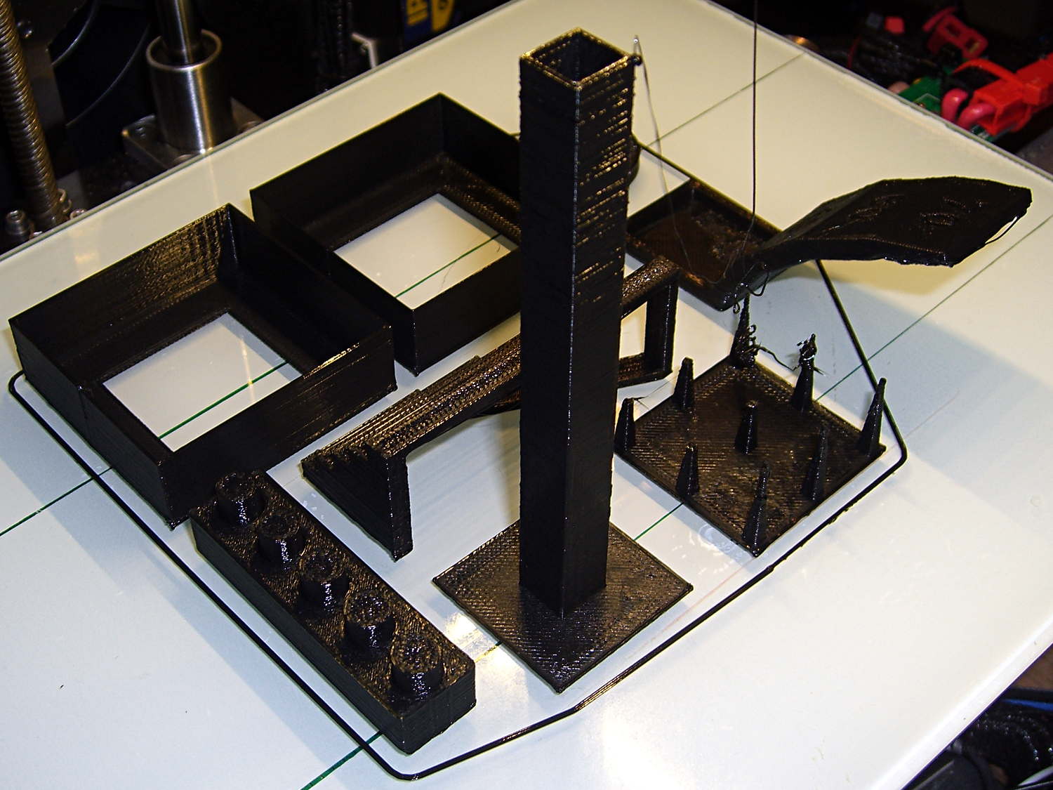 I think it’s either a 2 or a 3, but opinions will certainly differ. Hot off the platform, five of the nine spires completed successfully. Three other got almost done, but broke off in handling. The collection of drool on the left-middle spire seems to be from the uncompleted spires in the foreground; I think there just wasn’t enough adhesion to hold them together. The perimeters ran at 50 mm/s and the infill at 150 mm/s, because it’s printed with everything else, so it wasn’t done with the delicacy it would get in isolation.