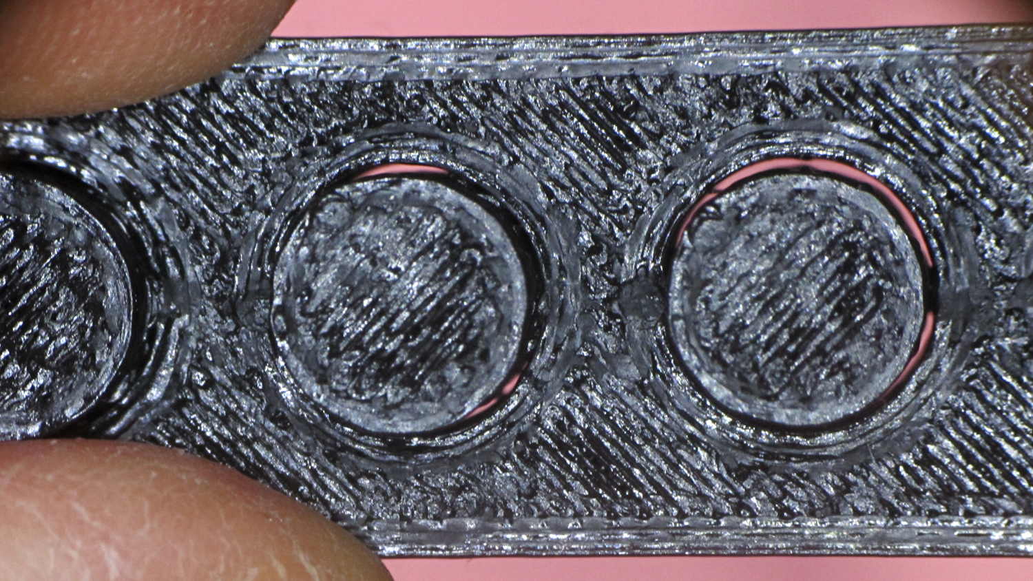The Negative Space Tolerance block weighs in at 2, as the pins with 0.6 and 0.5 mm clearance pushed out with finger pressure. The 0.3 and 0.4 mm clearance pins have air nearly all the way around, but would require a sharp rap from a mallet. The 0.2 mm pin remains firmly stuck: