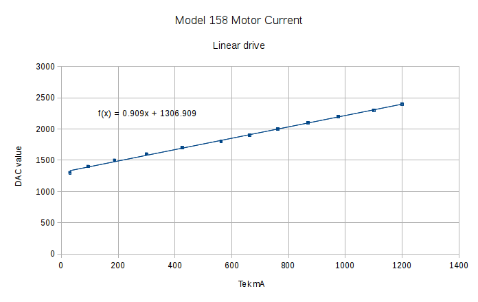Of course, the observed current tops out at 1.2 A: the motor’s peak current during normal linear operation. The line looks so pretty that I’ll assume it continues upward to the maximum 12-bit DAC value of 4095 and the corresponding ET227 current. Working backwards, that will be 3.1 A and should suffice for all but the highest peaks at high line voltage.