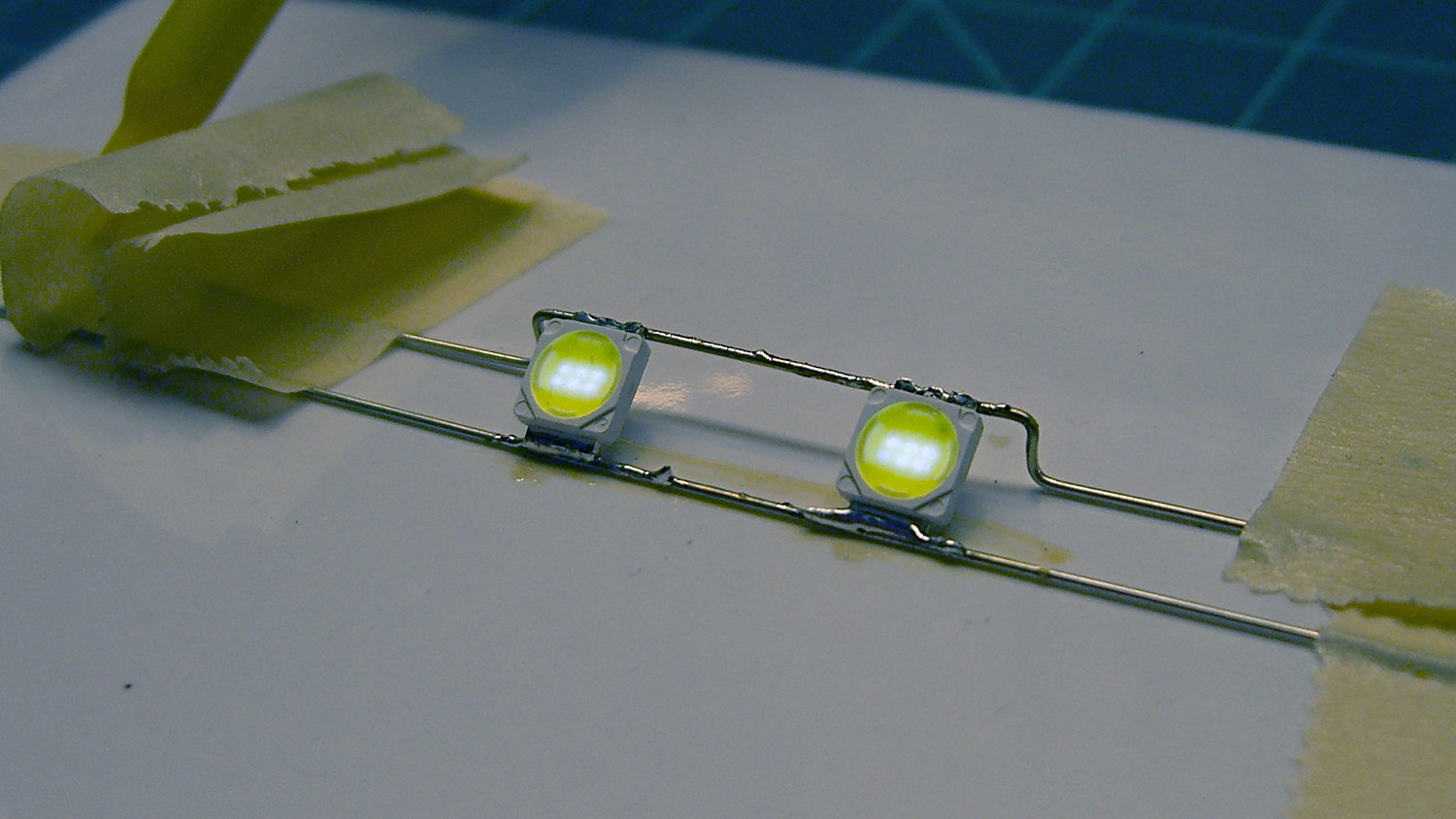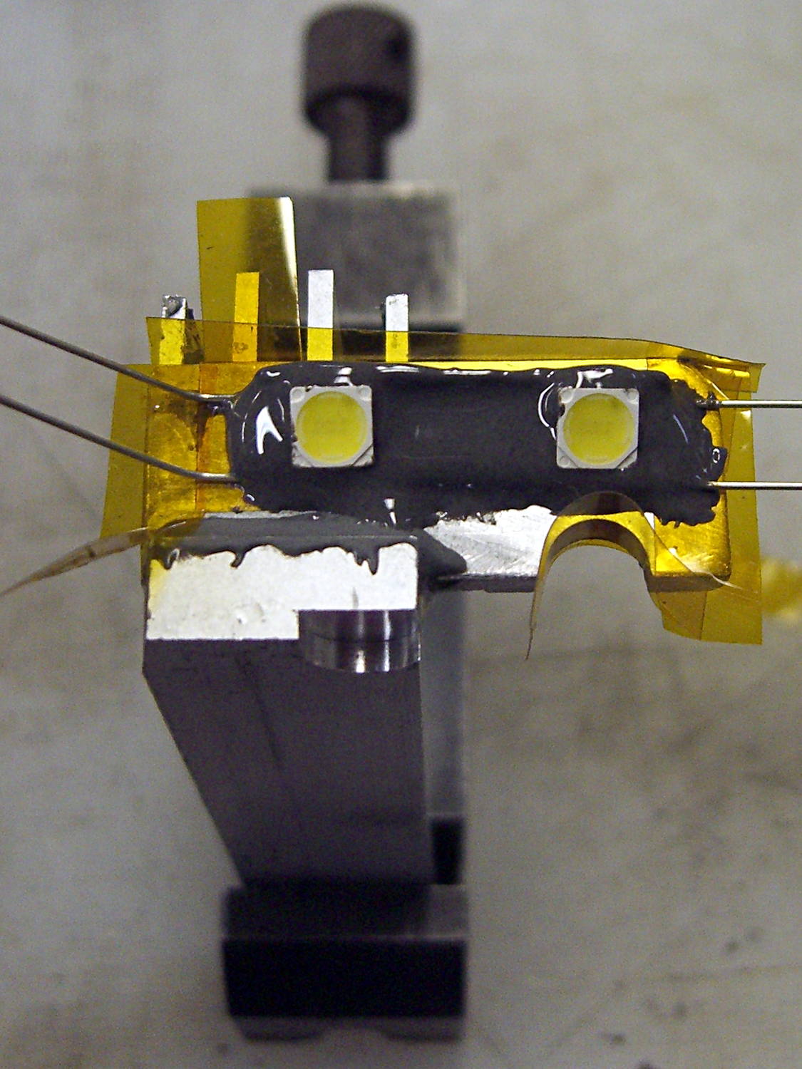 After the epoxy stiffened a bit, I gingerly positioned stranded wires not-quite-touching the LED wires and applied a dot of solder to each. Powering the LEDs from a bench supply at 500 mW each took the chill off the heatsink and encouraged proper curing: