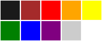 # create resistor-coded color spots # Ed Nisley - KE4ZNU # January 2015 SZ=8x8 convert -size $SZ canvas:gray10 -type truecolor Res0.bmp convert -size $SZ canvas:brown -type truecolor Res1.bmp convert -size $SZ canvas:red -type truecolor Res2.bmp convert -size $SZ canvas:orange -type truecolor Res3.bmp convert -size $SZ canvas:yellow -type truecolor Res4.bmp convert -size $SZ canvas:green -type truecolor Res5.bmp convert -size $SZ canvas:blue -type truecolor Res6.bmp convert -size $SZ canvas:purple -type truecolor Res7.bmp convert -size $SZ canvas:gray80 -type truecolor Res8.bmp convert -size $SZ canvas:white -type truecolor Res9.bmp montage Res*bmp -tile 5x -geometry +2+2 -resize 800% Res.png