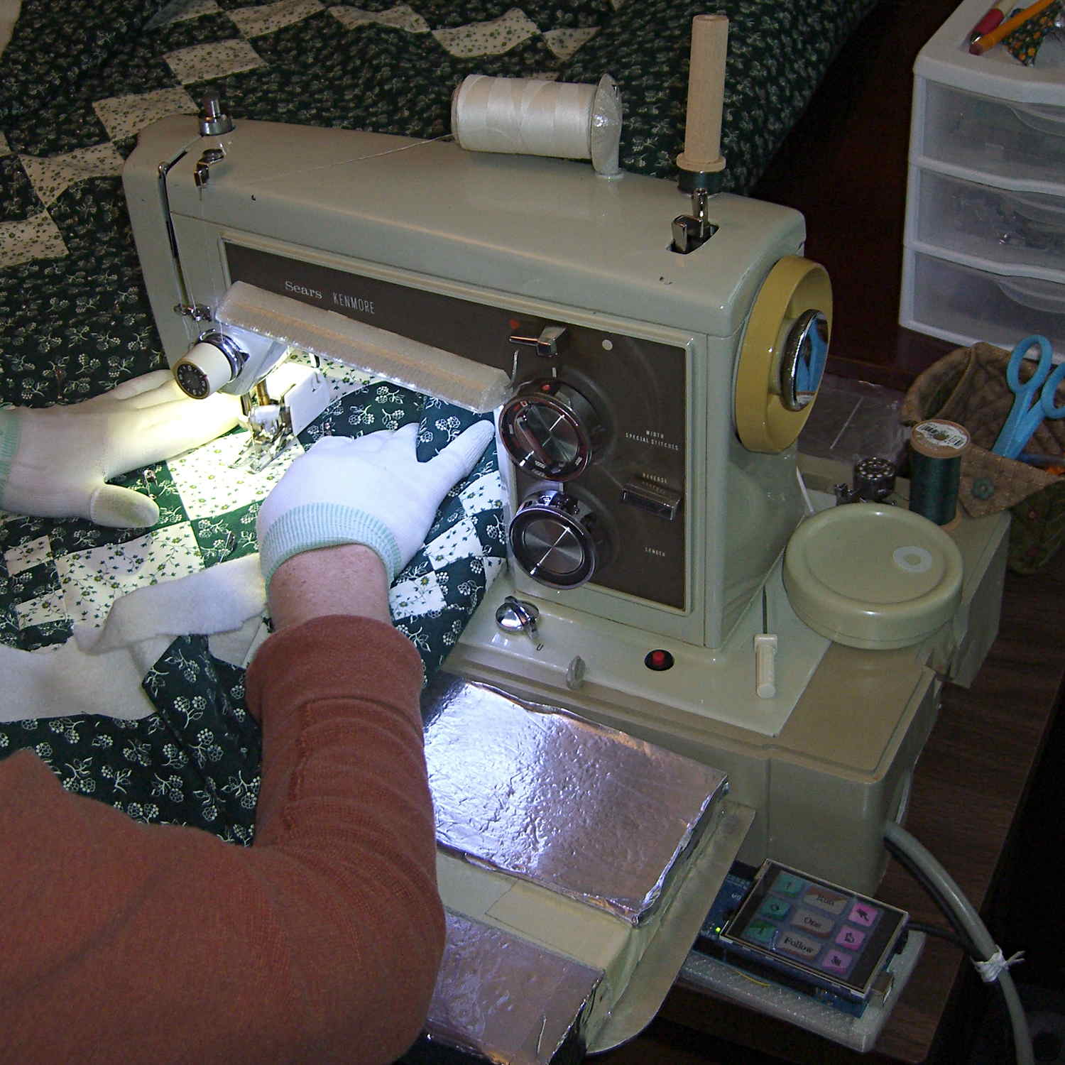 The Crash Test Dummy’s double-walled and somewhat crushed base turns out to be slightly larger front-to-back than the one on Mary’s original Kenmore 158 (which has a later serial number), but it still fits into the cutout in the insulating board we’re using in lieu of a Real Sewing Surface: