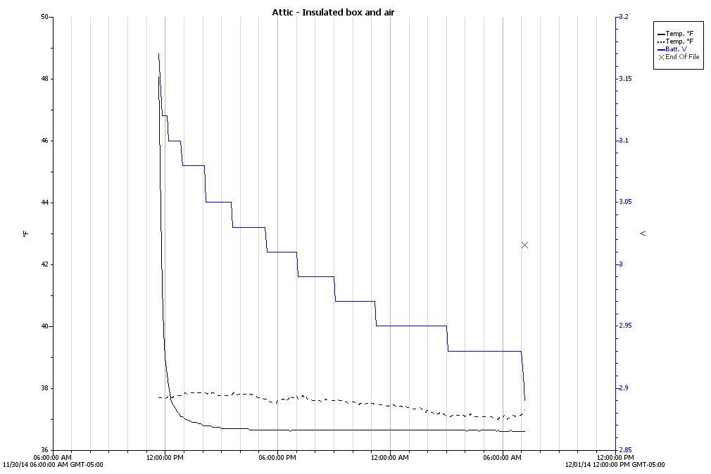 That happens just above 2.85 V, so the attic datalogger now carries an AA alkaline battery pack.