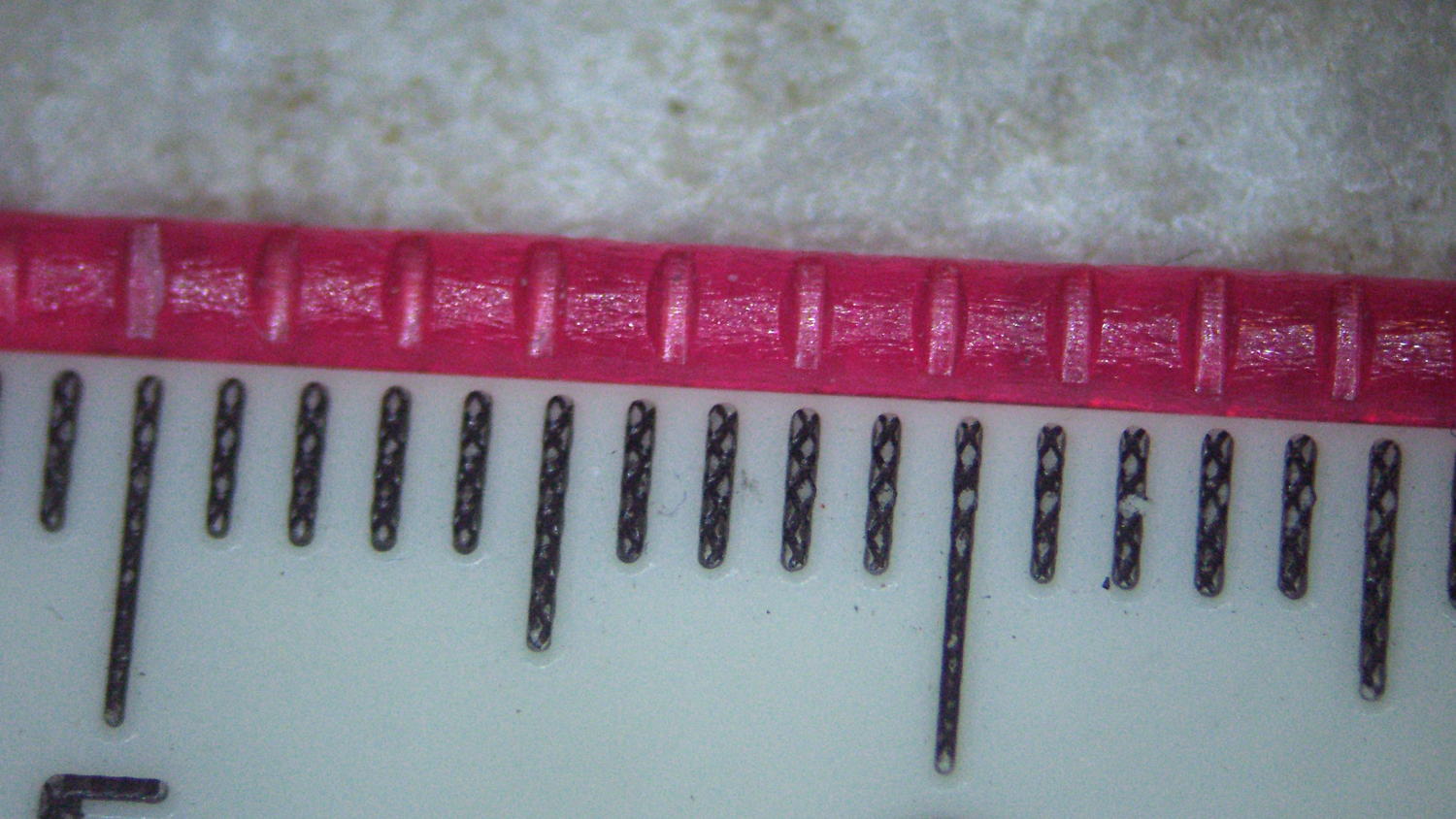 Squinting at the filament through a measuring magnifier says the indentations are 0.30 mm deep, which means the screw moved 1.0 mm after the actual “first contact” with the filament. That’s not surprising: PETG filament seems soft and easily indented, the force required to dent the filament doesn’t amount to much, plus there’s plenty of mechanical advantage from my fingers through the screwdriver to the filament.