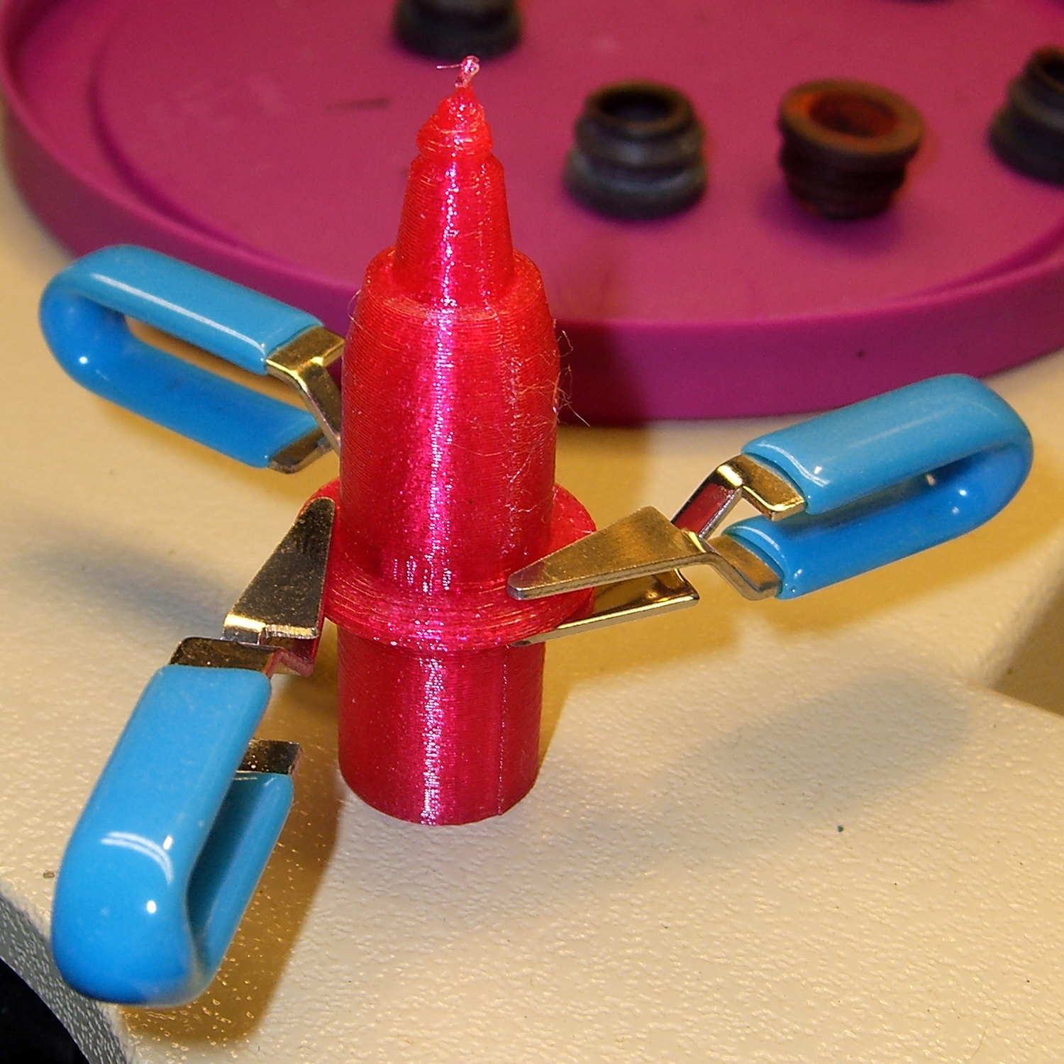 Note that the carousel and pen holder contact the flange and the cylindrical body, not either of the tapered sections down to the tip. That means I can carve away the entire bottom part of the body to make a drawing pen adapter…