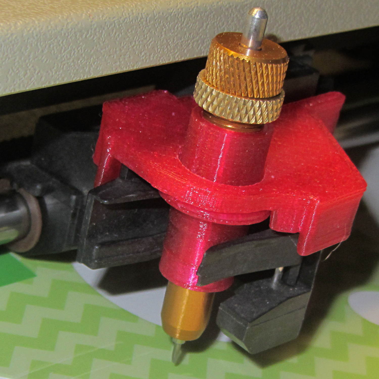 The cuts in the green vinyl just to the left of the knife blade (in a window decoration sheet I spotted in a trash can) show that the blade can cut, albeit with some finger pressure, but the fancy red stabilizer didn’t stay stuck on the pen carrier nearly as well as I expected. A screw attachment will help with that, which calls for going all digital on those coordinates.