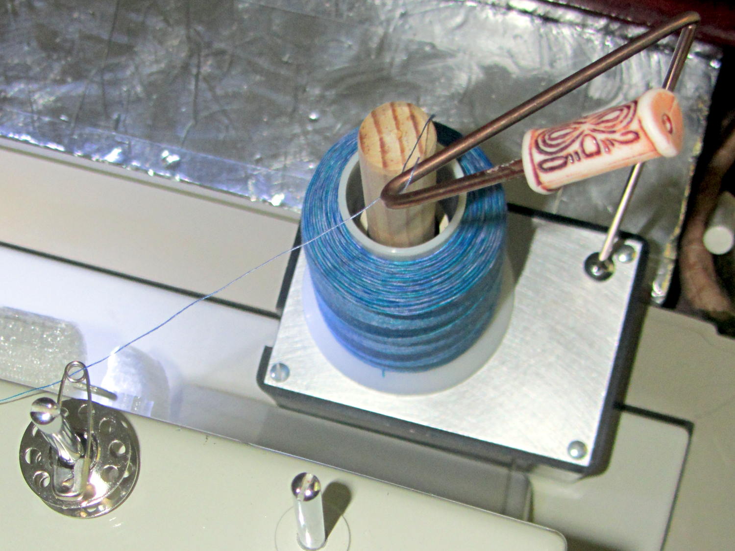The safety pin atop the bobbin on the left spool pin feeds the thread into the machine’s upper thread guide at the proper angle to make it all work; a direct line from the spool holder hook isn’t quite right.