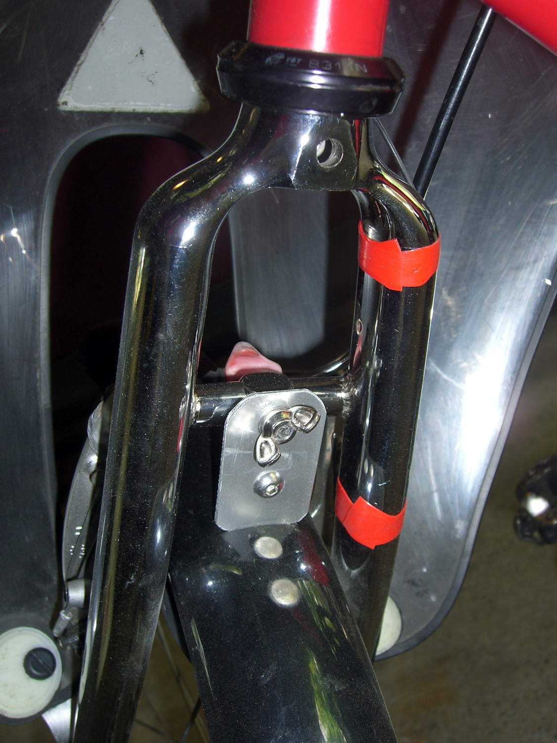 The garish red silicone tape replaces the previous black cable ties. It matches the tube paint surprisingly well and doesn’t look good on the fork, so I’ll replace it with cable ties in due course.