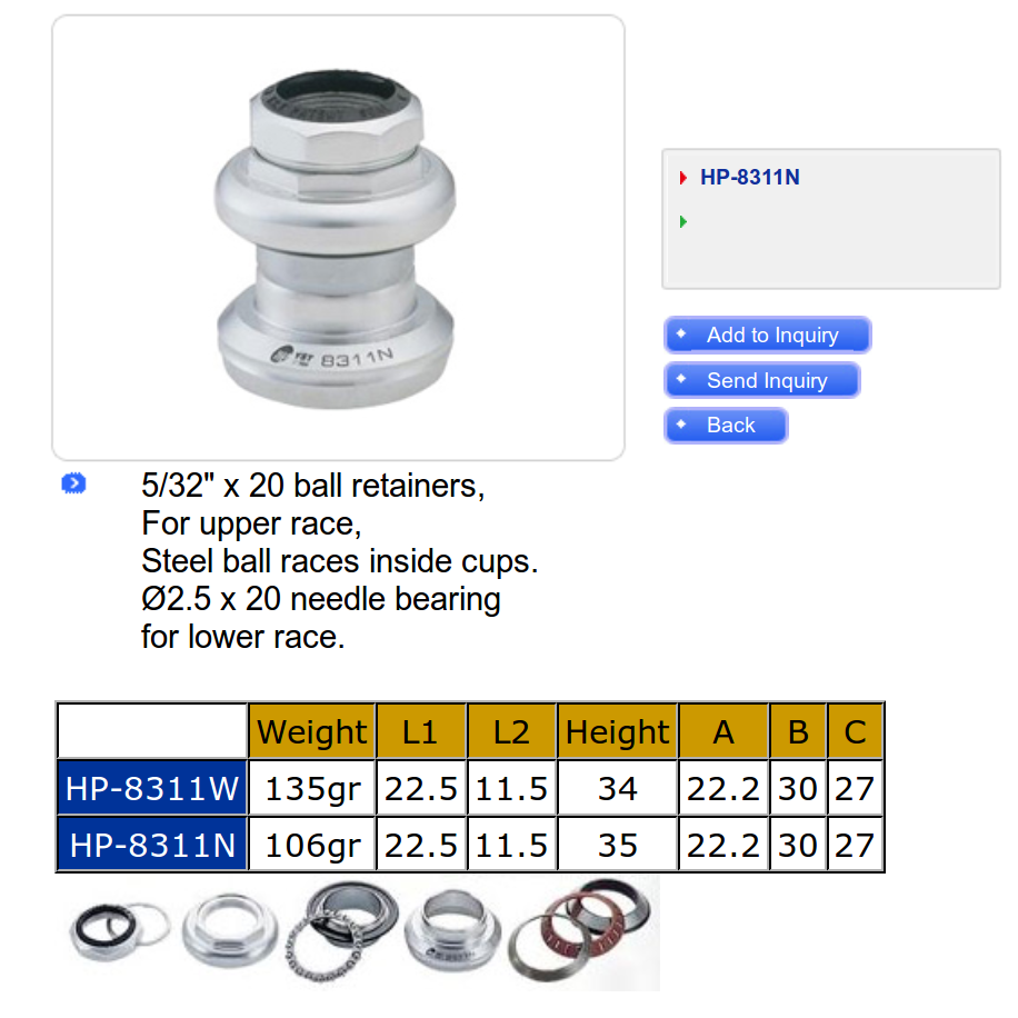 The lower bearing (a YST 8311N in black) has rollers, not balls. The headset has J.I.S. 1 inch dimensions, captured in a screen grab to forestall link rot: