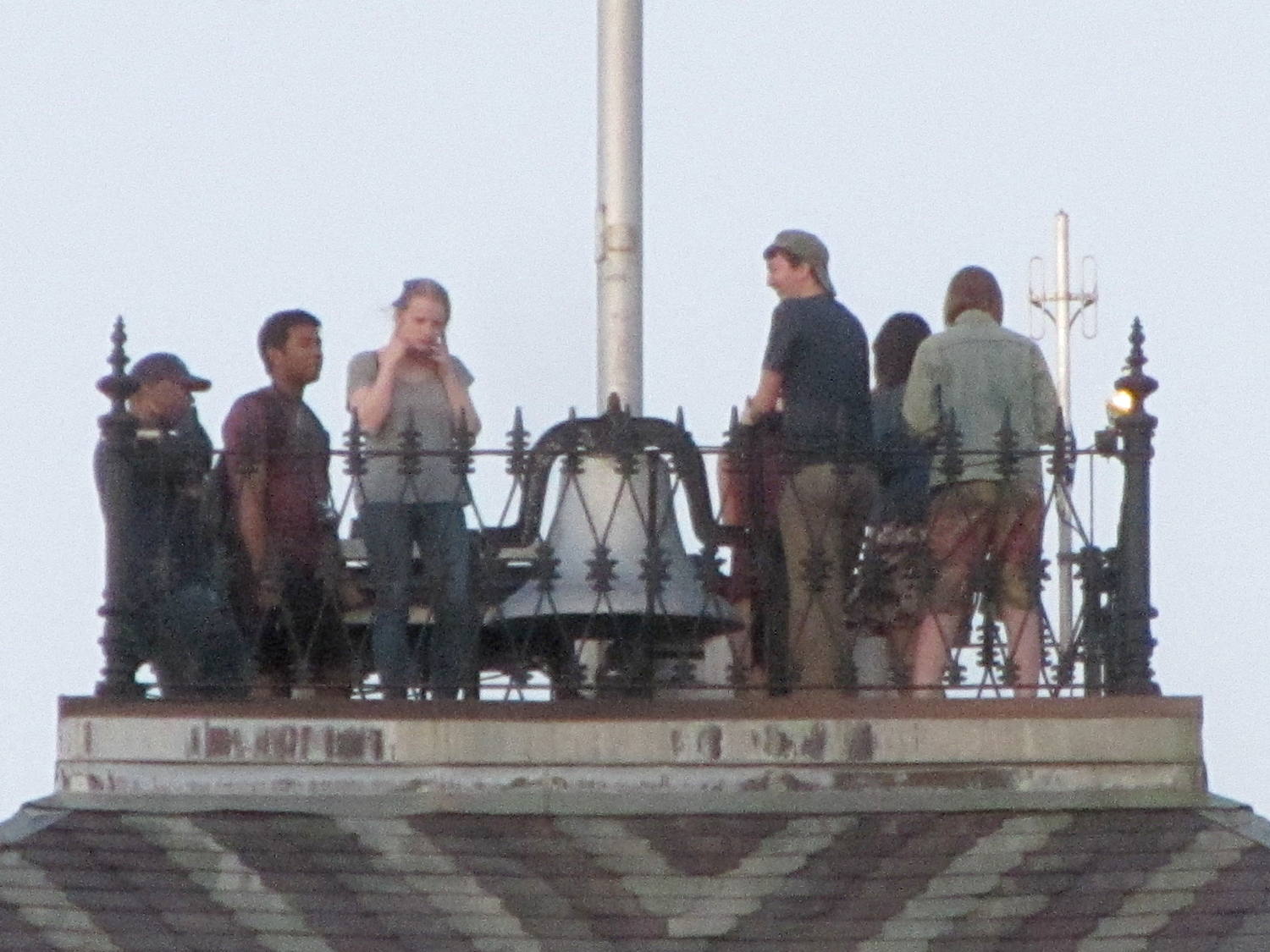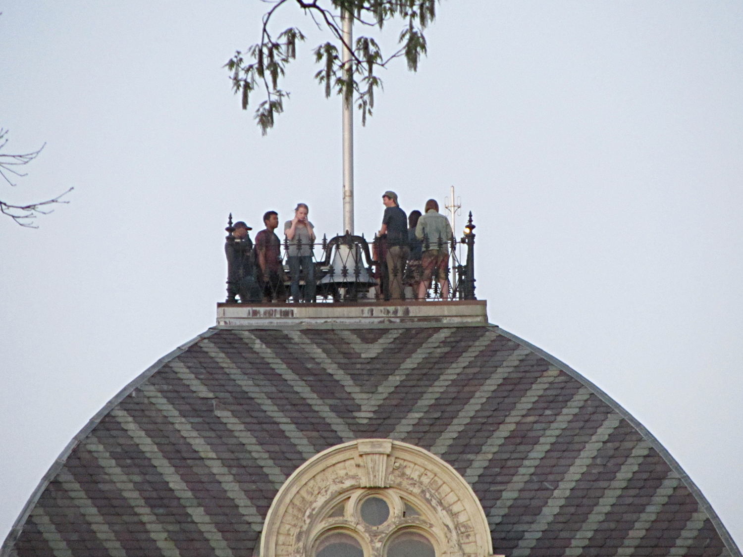 No, it’s not the guy leaning against the historic-but-flimsy railing. That folded-dipole antenna over on the right side most likely connects to Vassar’s 45 W UHF EMS repeater; at that range, RF can burn deeply.