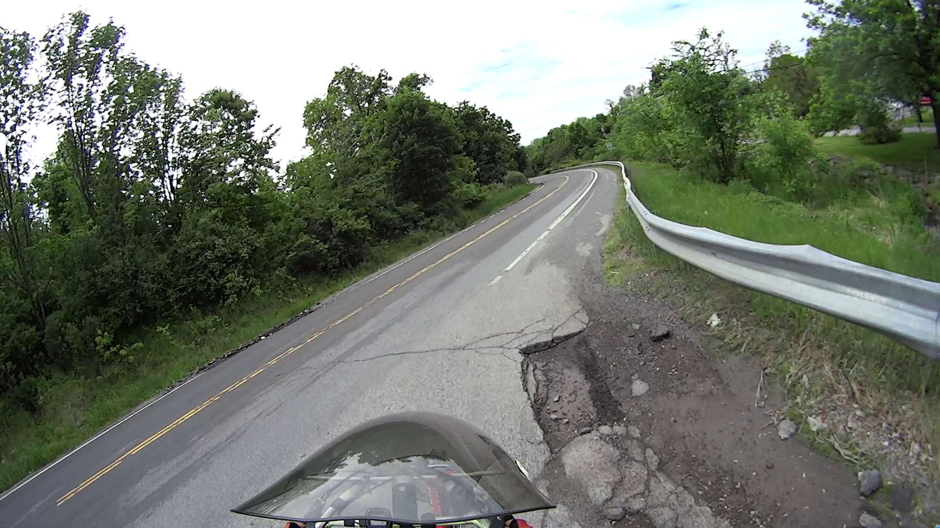 In this spot, the potholes expose three layers of paving. The only “safe” line seems to be on the very edge of the “new” cap, just to the right of the potholes: