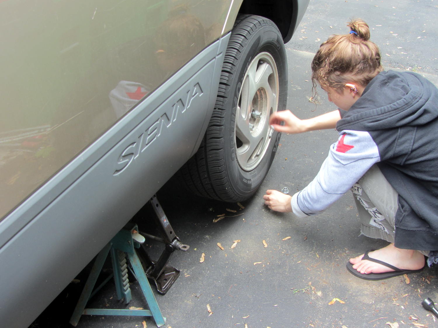 Good job by your daughter on the jacking and tire removal job. But maybe run her through the Red Wing shoe store on her next birthday, Dad :-)