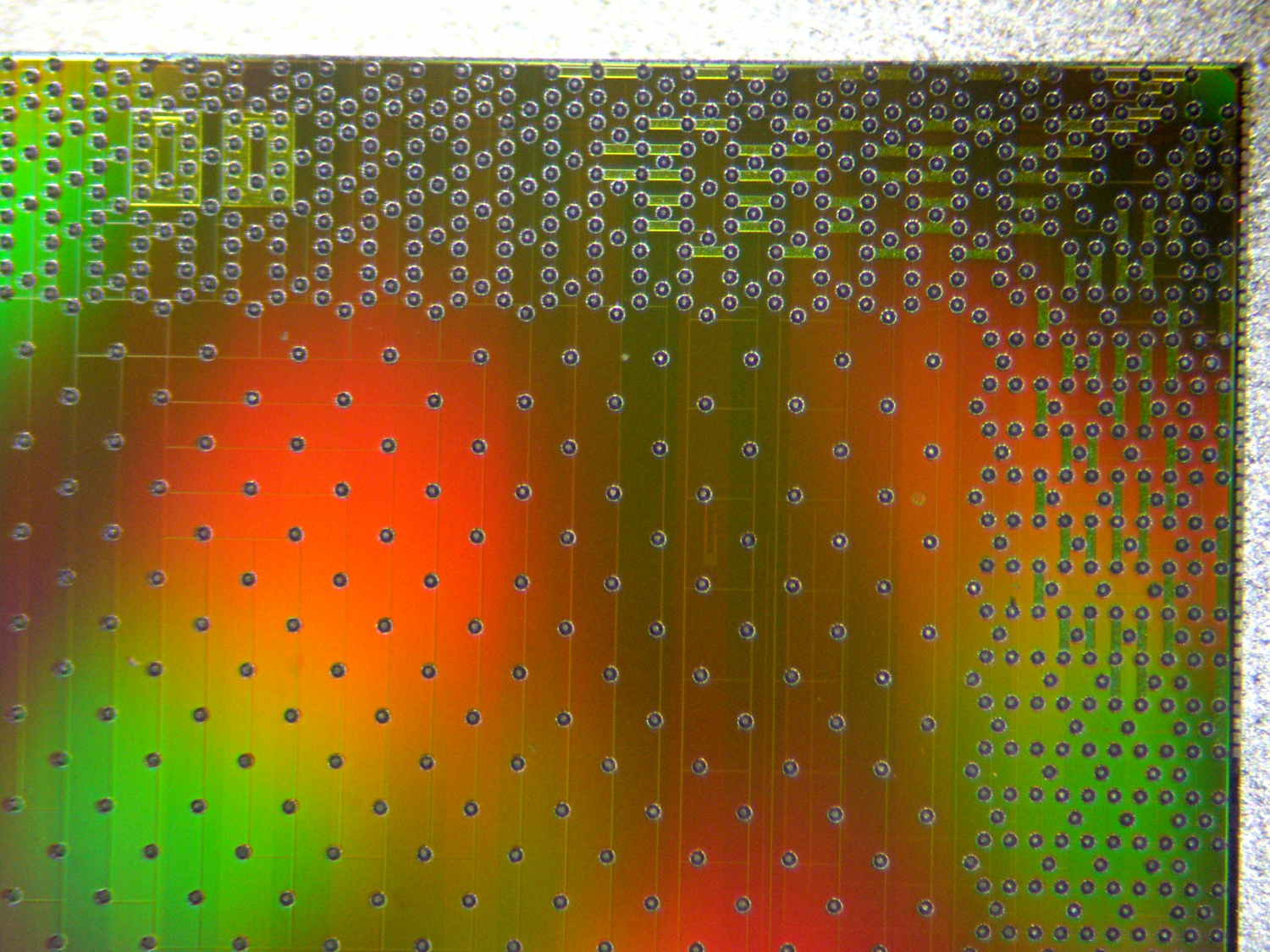 Some chips have an anti-tamper metallization layer on top to avoid probing attacks, and can detect if that layer is damaged and do a wipe. However, this doesn’t really look like any of those. I also thought it might be part of a printhead, but that doesn’t look right either.
