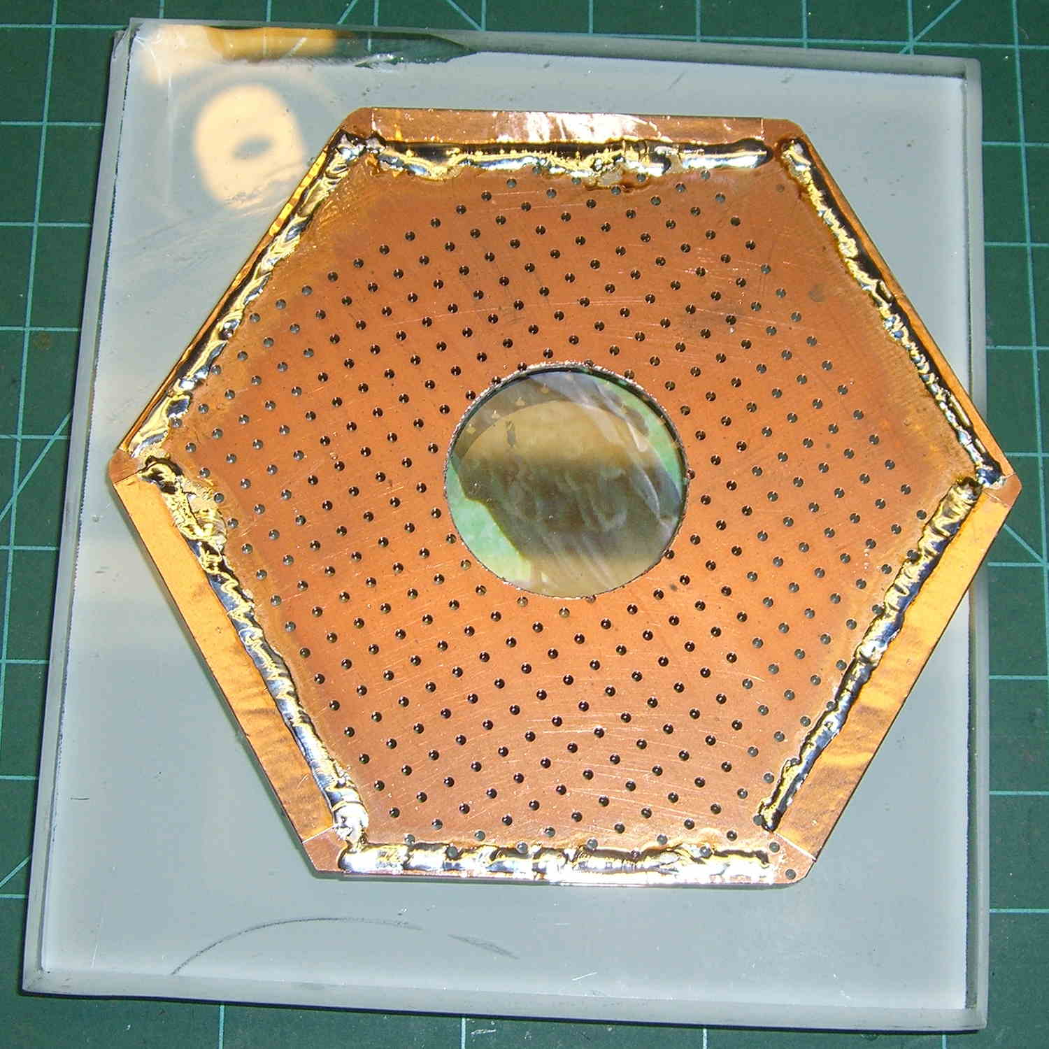 Just to have something to work with, I cut a hex from a sheet of double-sided PCB stock and bonded the edges with copper foil: