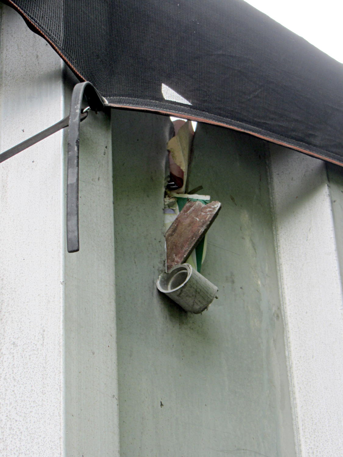 Apparently, they dump the scrap into the trailer from a great height and, sometimes, a bar can gash the aluminum side wall. That slice obviously predates the current load, but you can see how it happened: dump a load atop a bar leaning against the side and you get a giant metal shear.