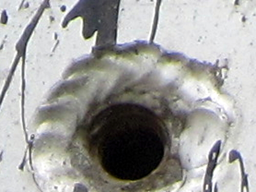 I didn’t notice the circular feature at the bottom center until I looked at the picture, but it certainly reminded me of a bullet hole in glass plate. Close inspection of the original image suggests it’s a welded stress relief border around a drilled hole, perhaps with a boss on the inside of the trailer:
