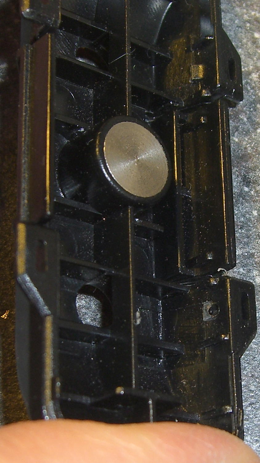 Surprisingly, the round head of a brass 0-80 machine screw fits neatly inside the square socket on the frame; they’re a bit more than 1 mm deep. The approach ramps visible below the sockets guide the latches on the base: