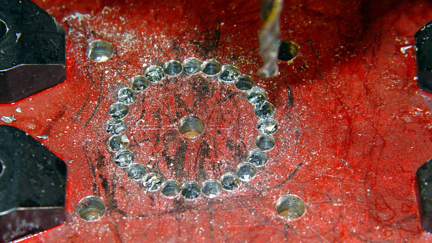 The least horrible way to cut out the hole for the motor mounting boss involved chain drilling to excavate the most steel with the least effort. These center drill points are at G0 @14 ^[15*i] with i in [0..23]: