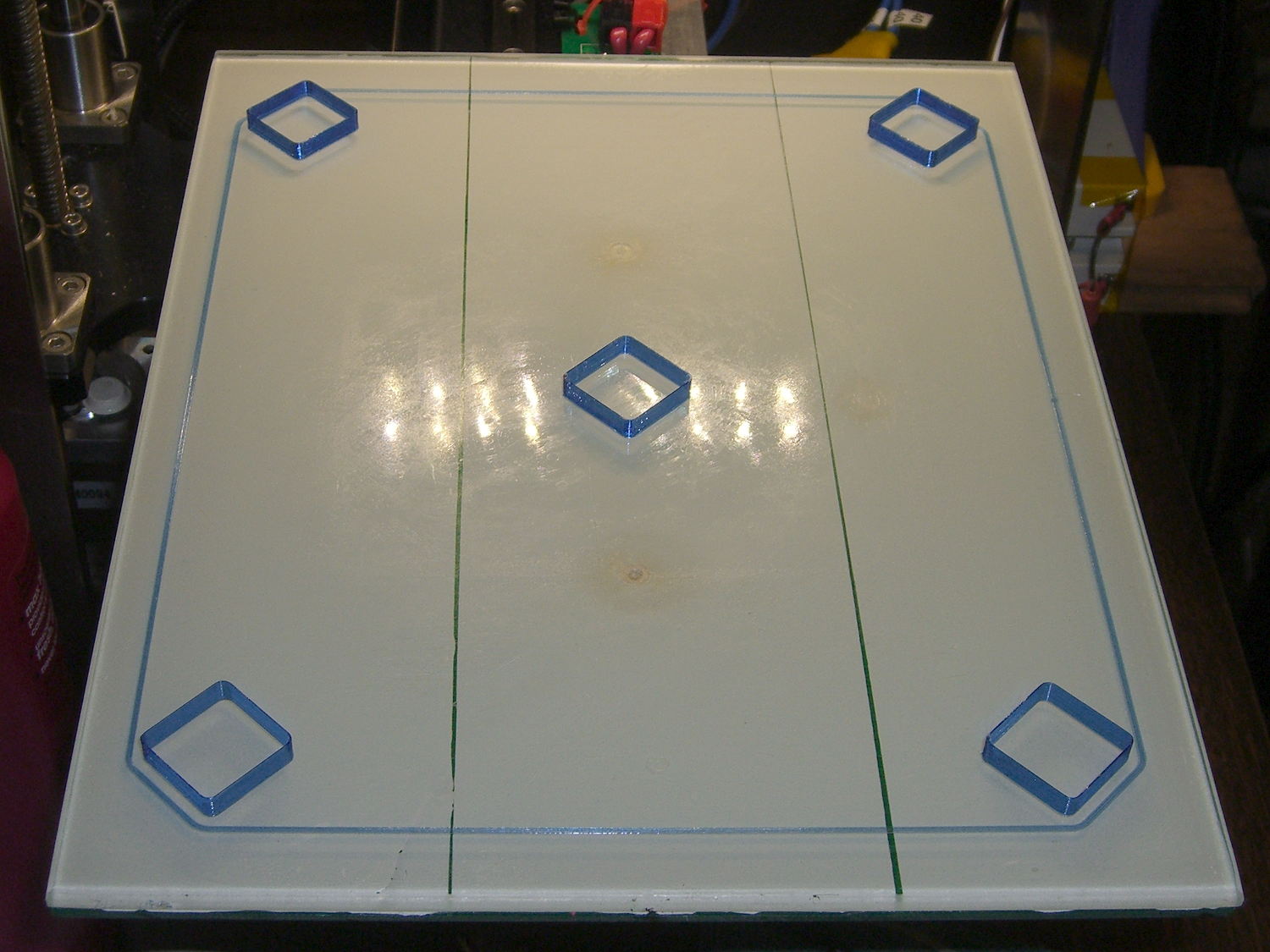 Adjusting the first layer thickness by tweaking the initial Z-axis home position in the startup G-Code allows fine tuning without fussing with the mechanical settings. Having moved the Z-axis home switch to the middle of the X-axis gantry eliminates all those adjustments; tweaking the G-Code is the only way to go.