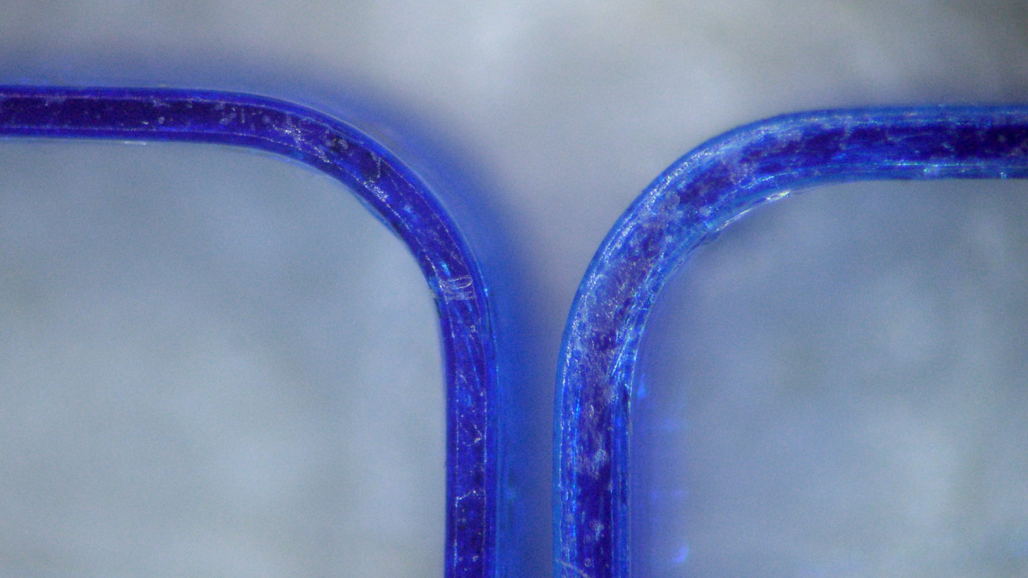 Because the Z axis moves upward (on the M2, the platform moves downward) by exactly the layer thickness at the end of each layer, the first layer must absorb the entire difference between the desired thickness and the actual nozzle-to-platform distance. That squashed first layer is 0.10 mm thick, a bit less than half of the nominal 0.25 mm. The second layer of each box looks just like all the higher layers.