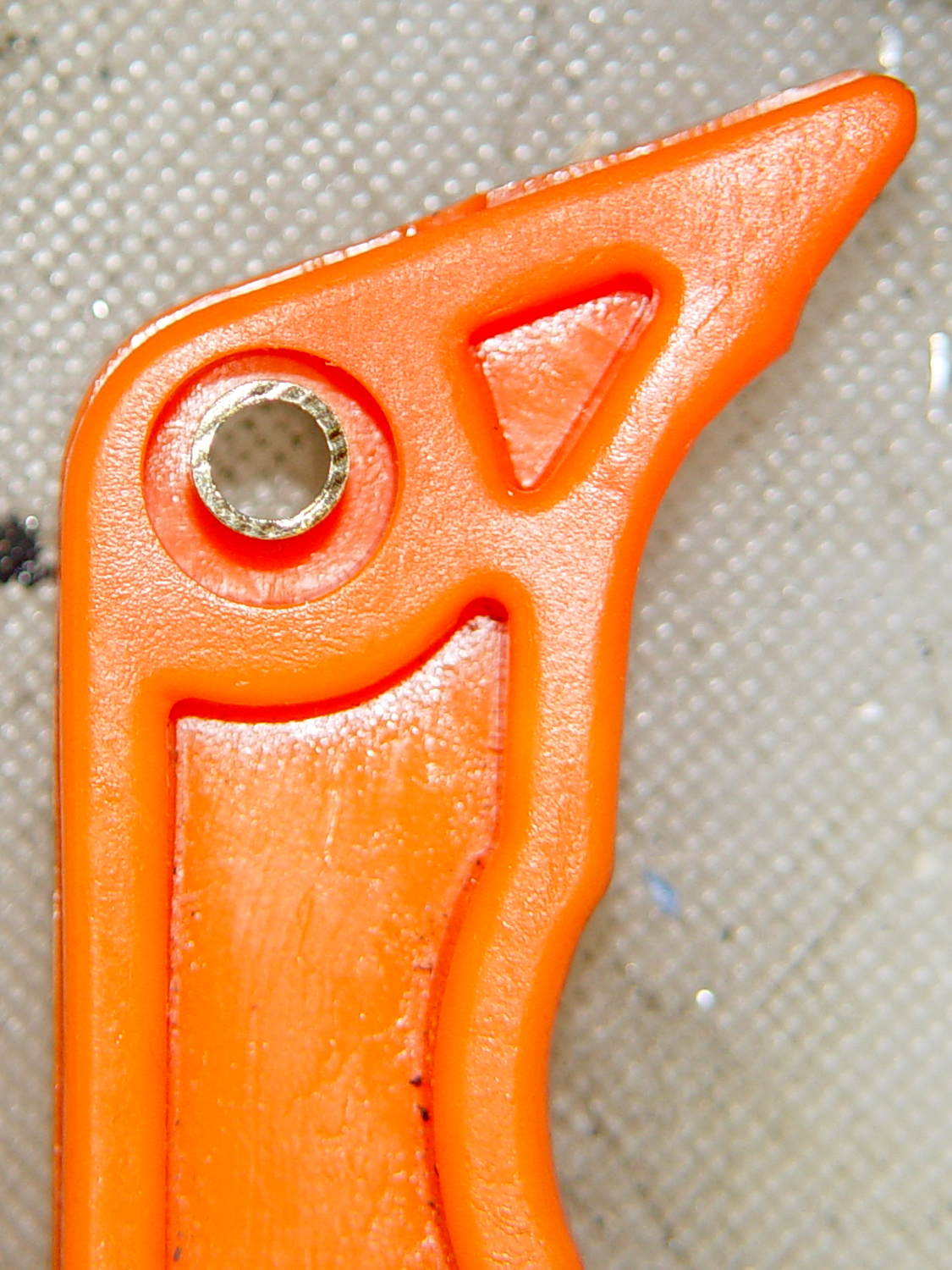 The orange handle magnifies the applied force by the (more or less) 4:1 lever arm and applies it against two hollow plastic bosses on the side plates. The one just below the handle broke free, which is exactly what you’d expect to happen.