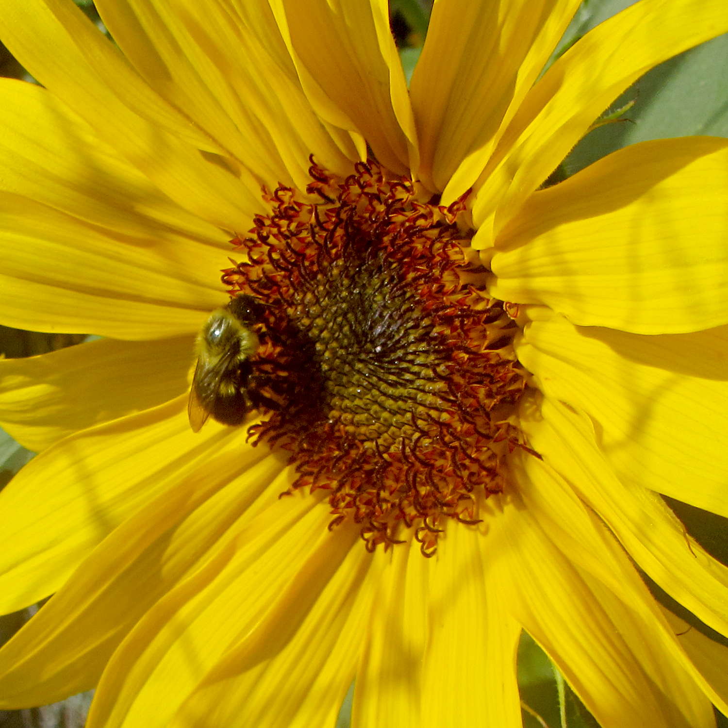 A stray sunflower seed decided that the spot just outside the garden gate was perfect and gave Mary’s garden an attractive marker. It will eventually have a dozen blossoms, each one serving as a buffet for the local bumblebees:
