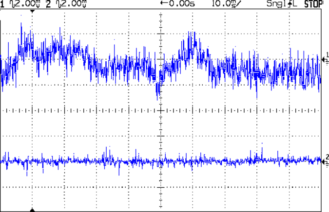 A single gamma ray event producing an unreasonably high 10 fA chamber current will cause a downward (it’s an inverting amplifier) pulse that amounts to a mere 100 µV, a pulse that obviously isn’t visible against all that racket. You might convince yourself that the event at the center of the top trace comes from a gamma ray, but you’d probably be wrong.