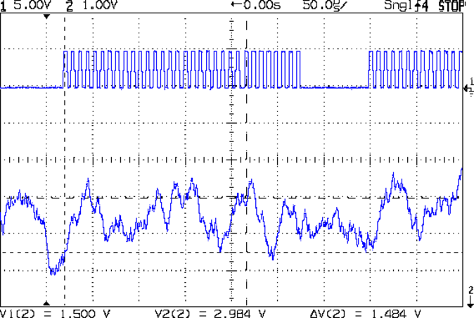 The vertical cursors mark the LSB position in the first and last bytes of the SPI clock. The horizontal cursors mark the minimum VIH and maximum VIL, so the sampled noise should produce 0 and 1 bits at the vertical cursors. Note that there’s no shift register on the input: MISO just samples the noise signal at each rising clock edge.