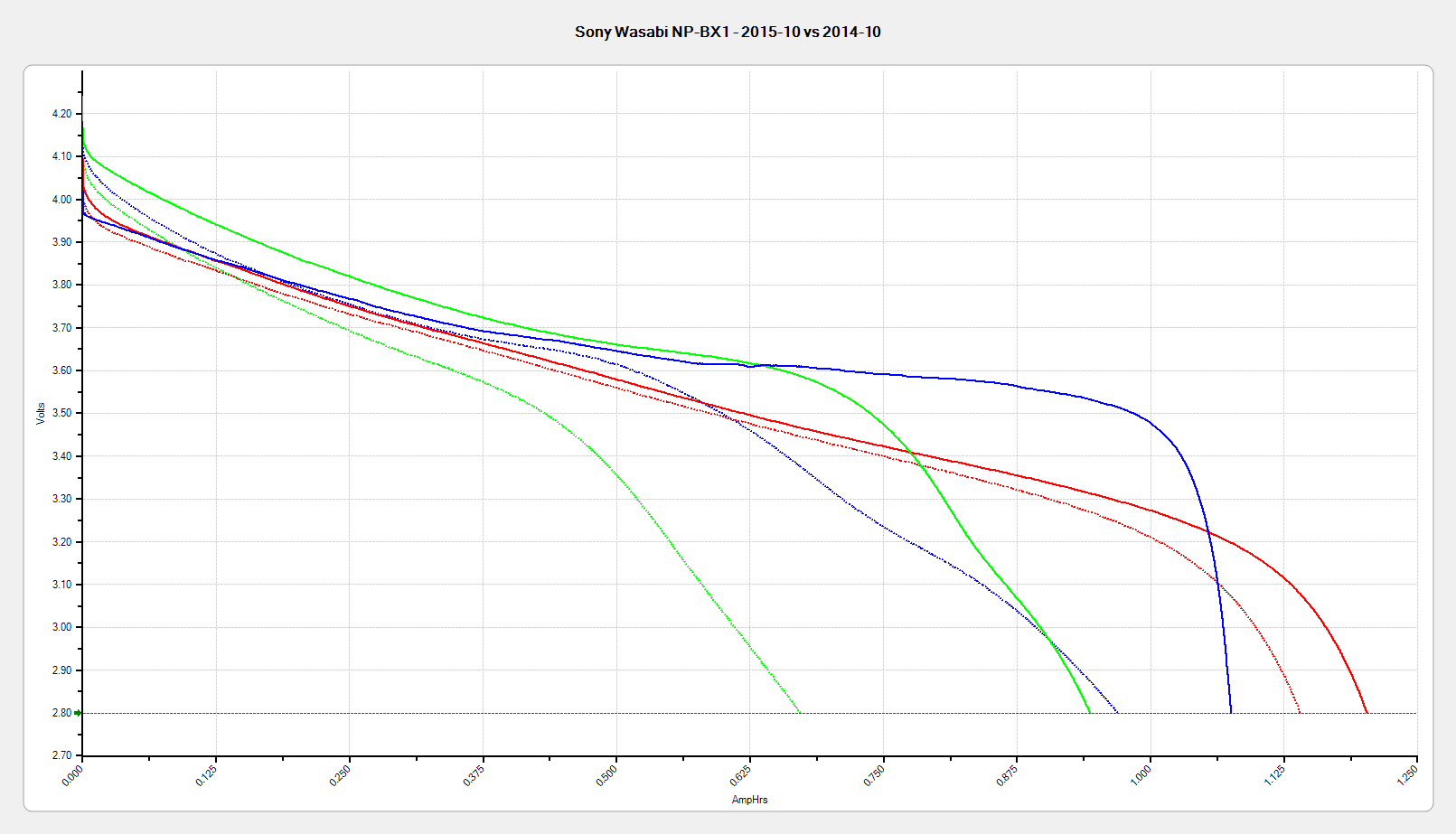 Much to my surprise, the Wasabi batteries started out slightly better than the Sony OEM battery, at least as measured by the available voltage and energy. The camera runs from an internal switching power supply, so the area under the curve (basically equal to energy in W·h) above the cutoff voltage is all that matters.