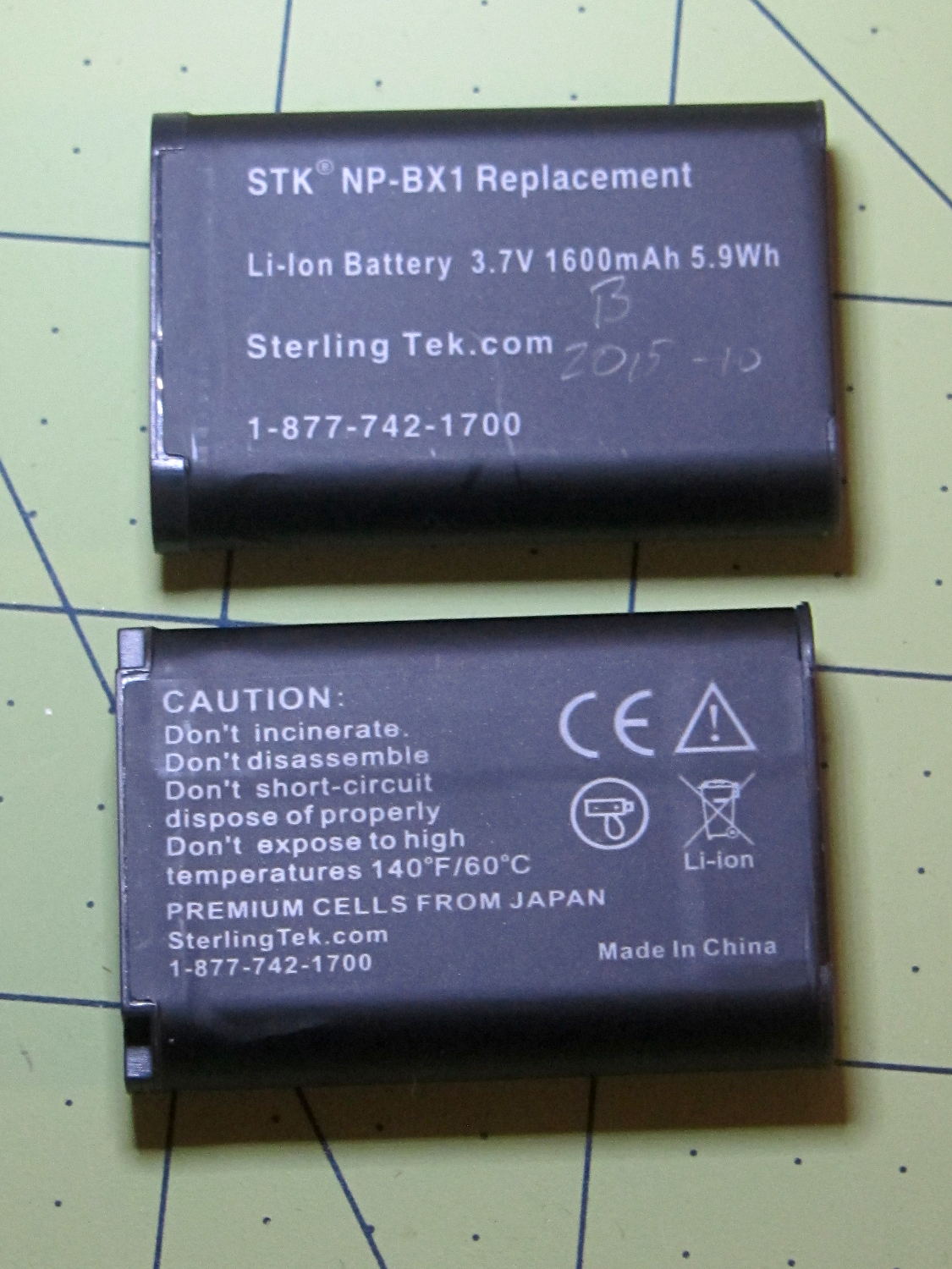 Because the first pair of Wasabi NP-BX1 batteries for the Sony HDR-AS30V camera faded to the point where they weren’t useful for a typical bike ride, I bought a pair of SterlingTEK (a.k.a. STK) NP-BX1 batteries that, like the Wasabi batteries, claimed to have a 1600 mA·h capacity. These are “second tier” batteries, not the cheap eBay crap I’ve already dismissed, and run a bit under $10 apiece.