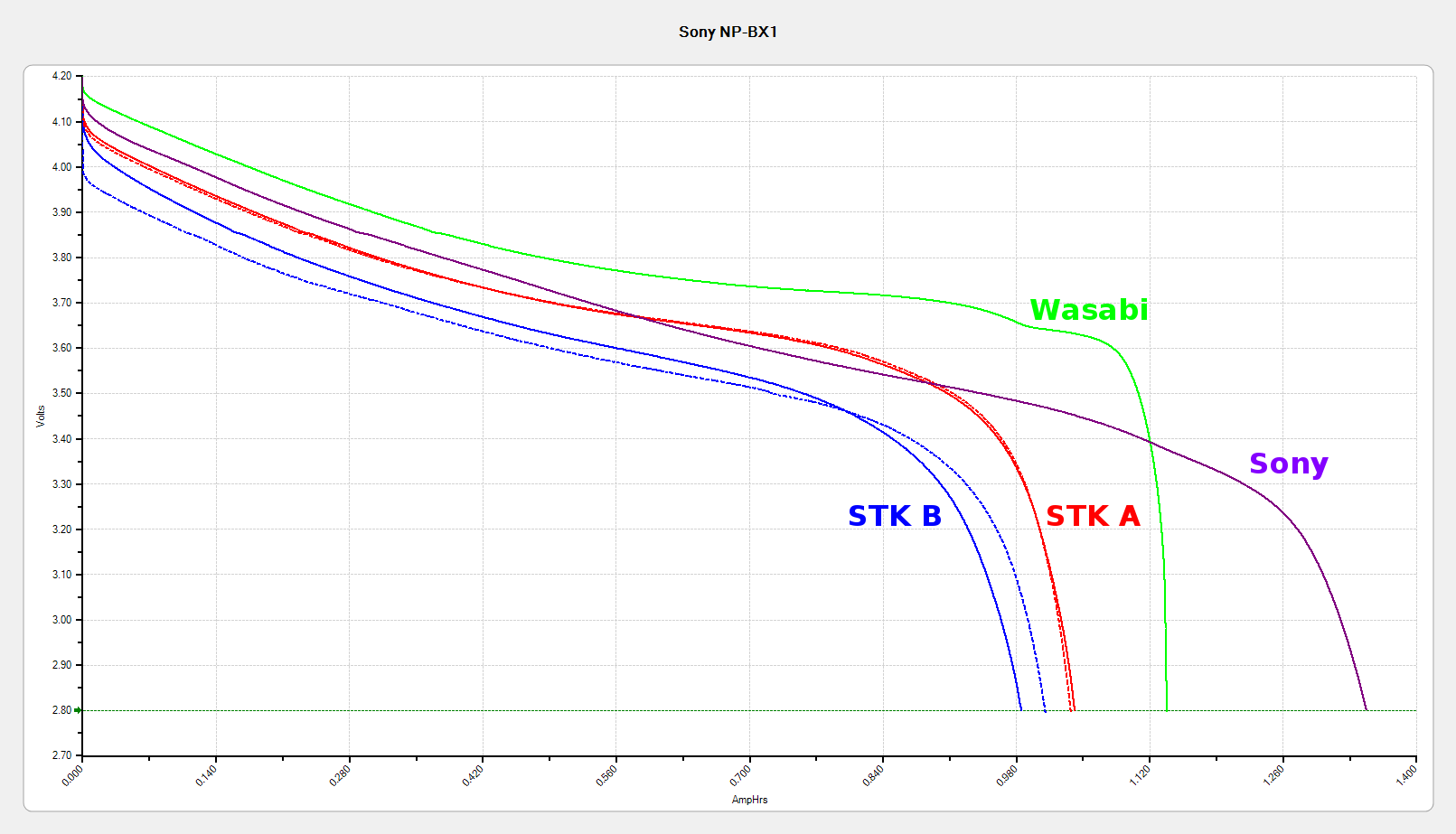 The red and blue curves show that the STK batteries produced less than 1000 mA·h in their first two charges, with the blue battery (I labeled it B) showing considerable variation that suggests it’ll suffer early failure. The green curve shows one of those Wasabi batteries and the purple curve is the OEM Sony battery, both in as-received condition.