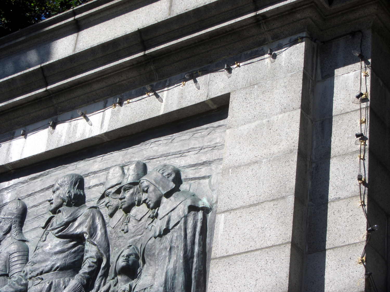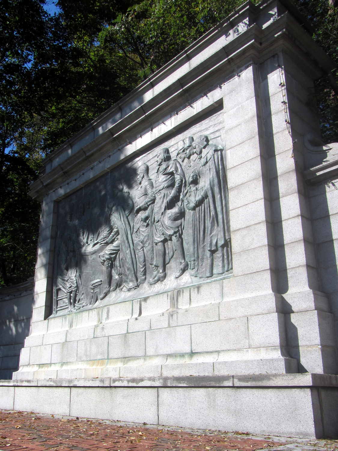 This imposing memorial plaque stands in a small park in Provincetown MA, at the foot of the hill from which the Pilgrim Monument emerges: