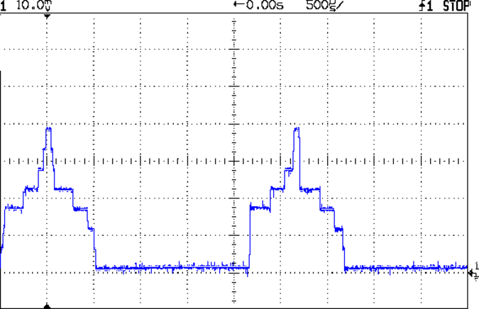 The 400 mA peaks happen when all seven Neopixels turn on at once. The broad flat floor means they’re off most of the time and the power supply sees a hefty 400 Hz pulsating load.